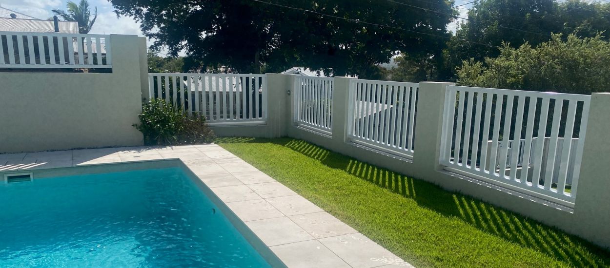 Aluminium vertical slat fencing was selected for its durability, low maintenance, and resistance to rust and rot. Unlike timber, aluminium will not warp, crack, or degrade over time, making it ideal for a pool environment. The Pearl White powder-coated finish provides a fresh, modern appeal to the front street view of the property while being easy to keep clean and maintain. The vertical slat design allows visibility and airflow around the pool area without compromising safety, delivering a practical and visually appealing long-term fencing solution.